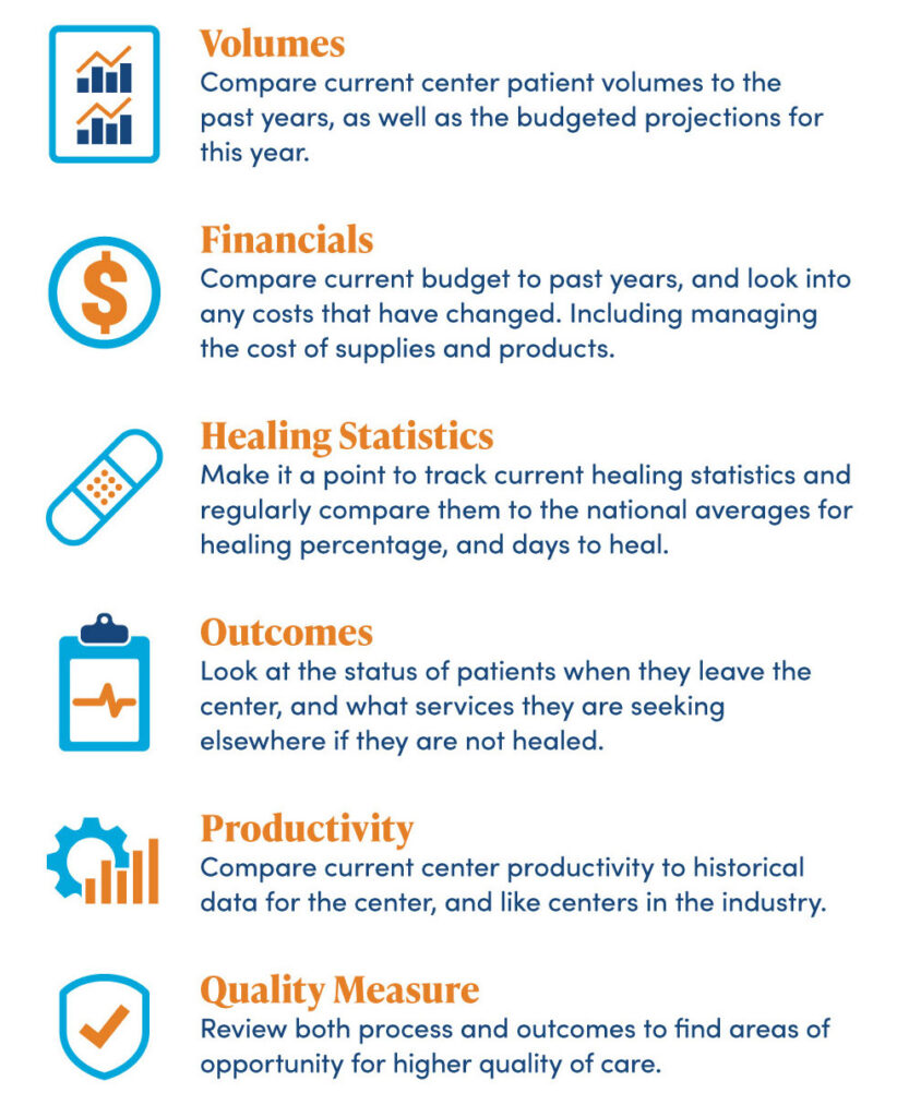 Reviewing the health of your center can be done by looking into specific Key Performance Indicators that will help understand the overall position of the center. From here, leaders can utilize this information to build action plans and goals for the future of the center. This proactive approach will lead to ongoing improvement and success. To reach sustainability, the KPI’s that should be tracked and reviewed on an ongoing basis for wound care centers are:
